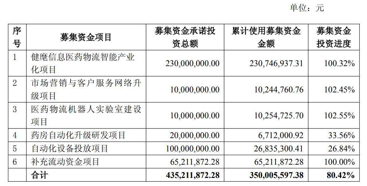 根据公告中公布的数据,截至去年12月31日,药房自动化升级研发项目及自动化设备投放项目的募集资金投资进度分别为33.56%及26.84%。